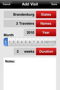 Have you traveled to any states in Germany recently? Would you like an easy way to keep track of your visits over the past and future years? This app keeps track of the regions that you and other family members and friends have visited, and also allows input of optional details that should be useful to you in the future. Includes the following features: