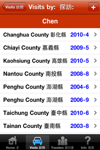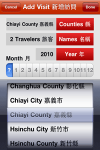 Have you traveled to any counties recently in Taiwan? Or provincial cities? Would you like an easy way to keep track of your visits over the past and future years? This app keeps track of the counties and provincial cities that you and other family members and friends have visited. It also allows you to input optional details that should be useful to you in the future. Includes the following features: