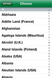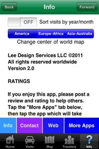 - Sort your countries/entities visited by alphabetical or year/month. The switch is on the "Info" tab screen and is "Off" by default. (Alphabetical by country is the default).