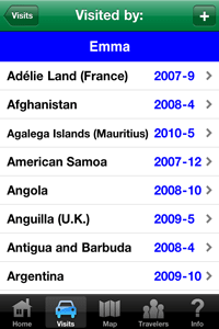 Have you traveled to any countries around the world recently? Would you like an easy way to keep track of your country visits over the past and future years? This app keeps track of the countries that you and other family members and friends have visited, and also allows input of optional details that should be useful to you in the future. Includes the following features: